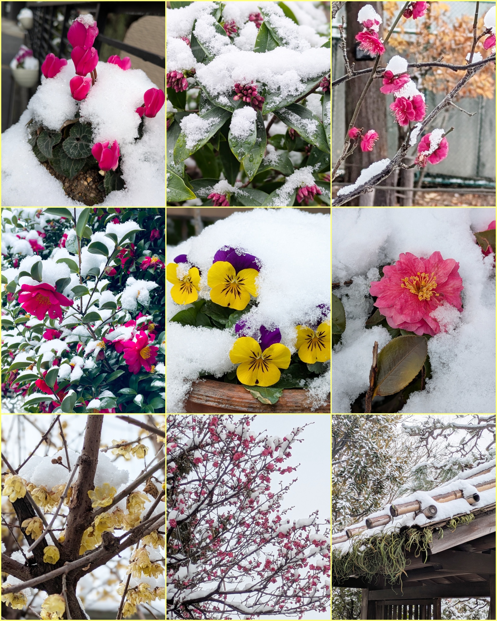 久しぶりの雪景色です。紅梅も沈丁花も椿も蝋梅もシクラメンも雪に埋もれて
